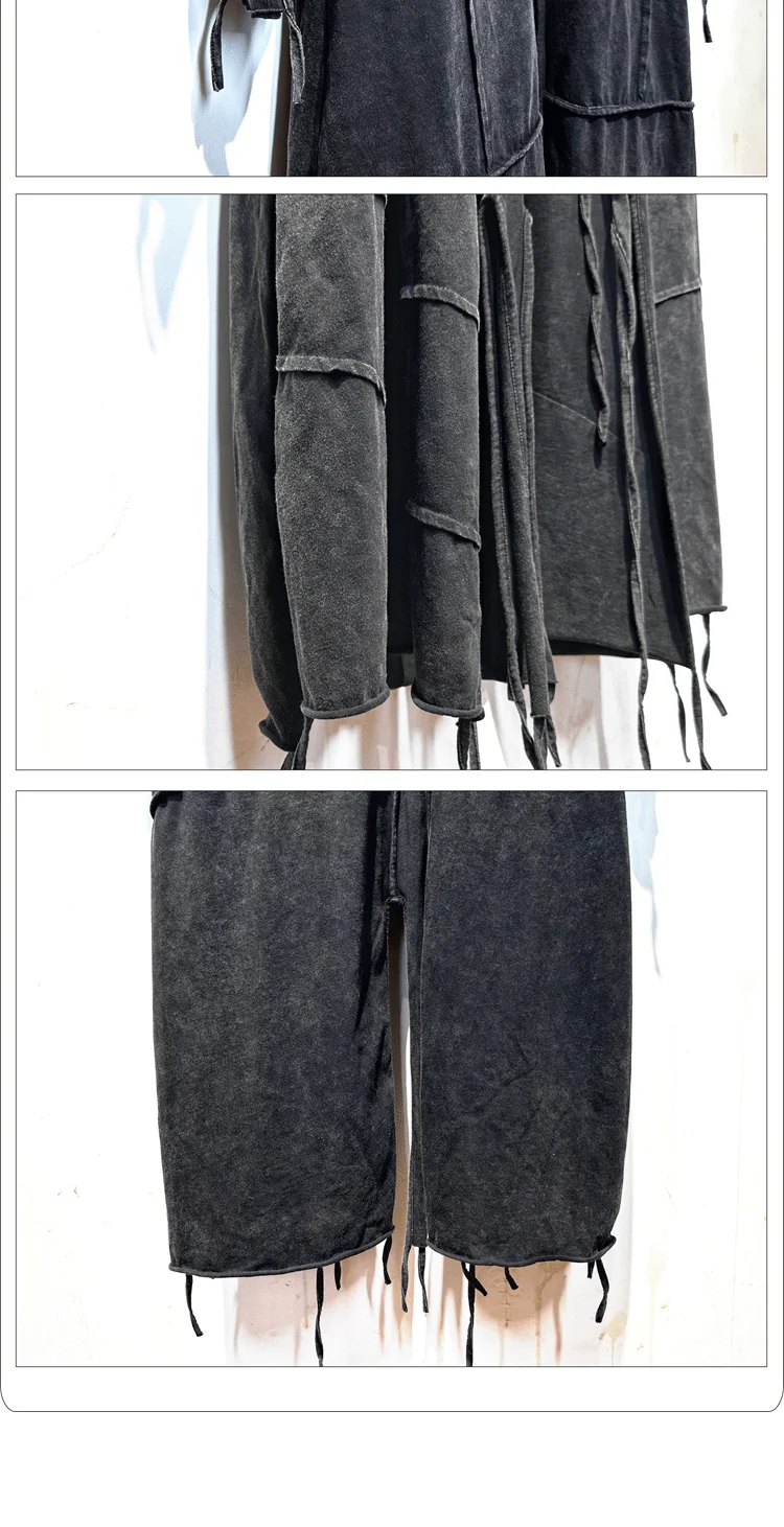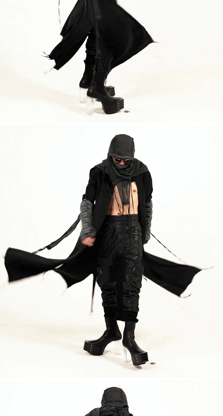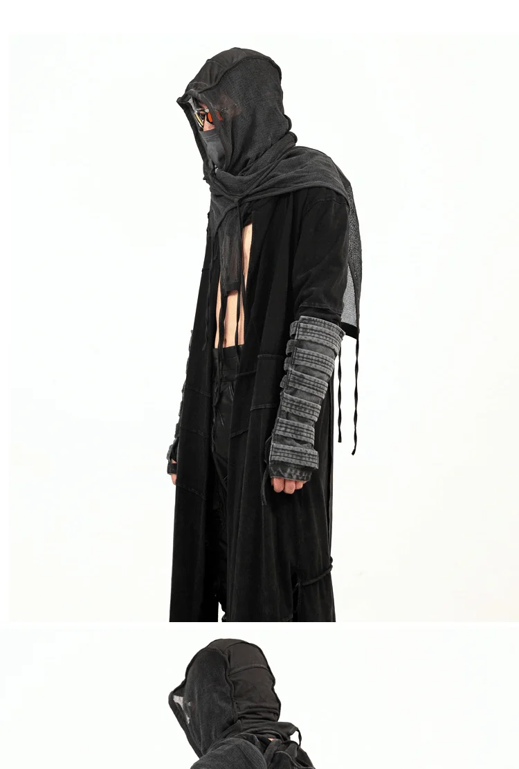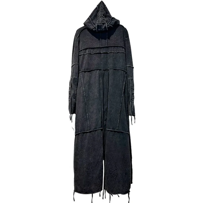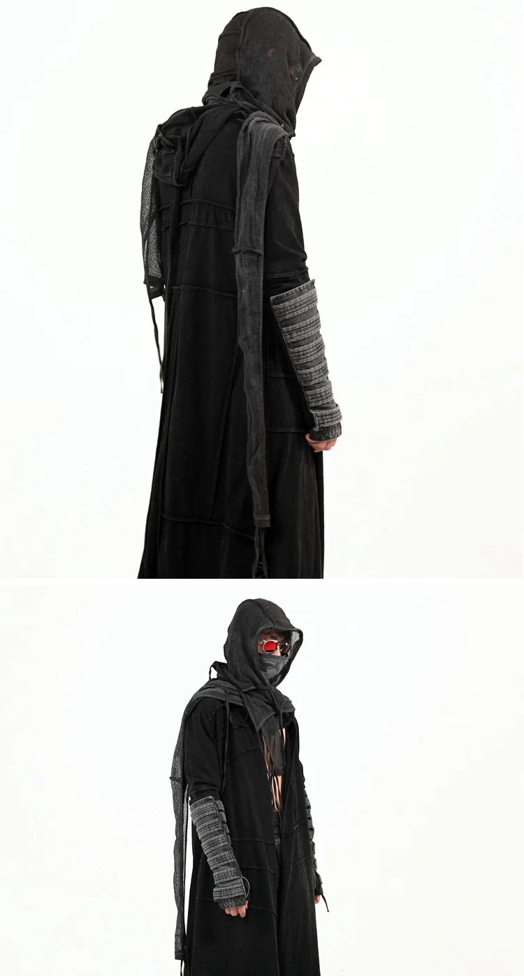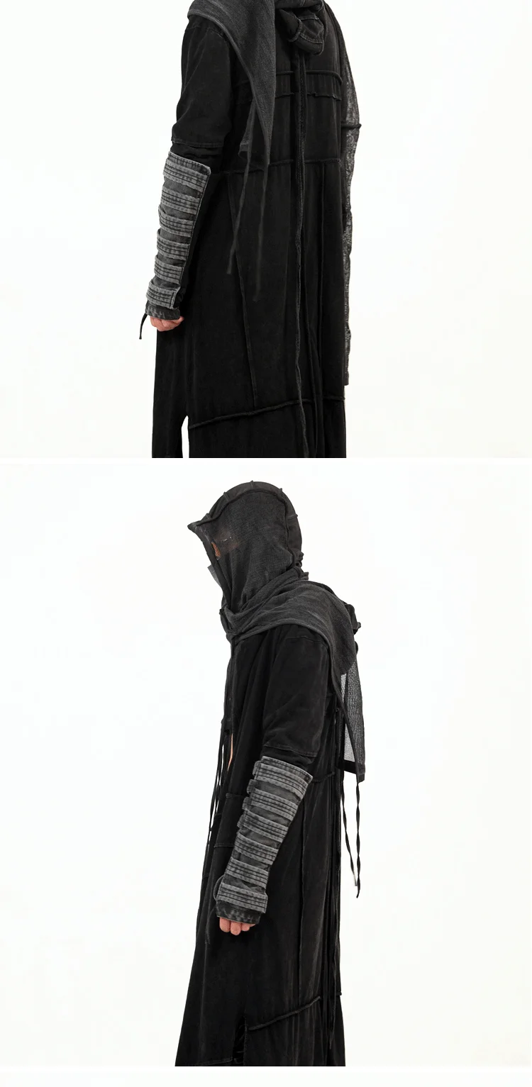 Vintage Men's Distressed Hooded Cape Hanging Vertical Cut Long Windbreaker Darkw